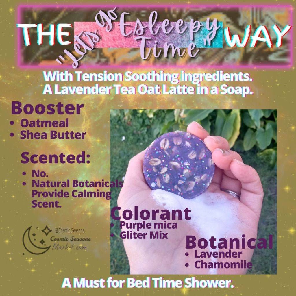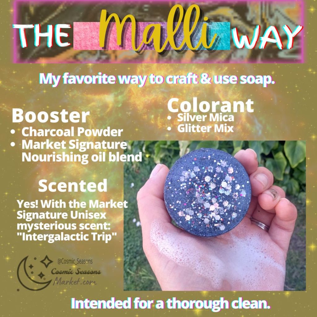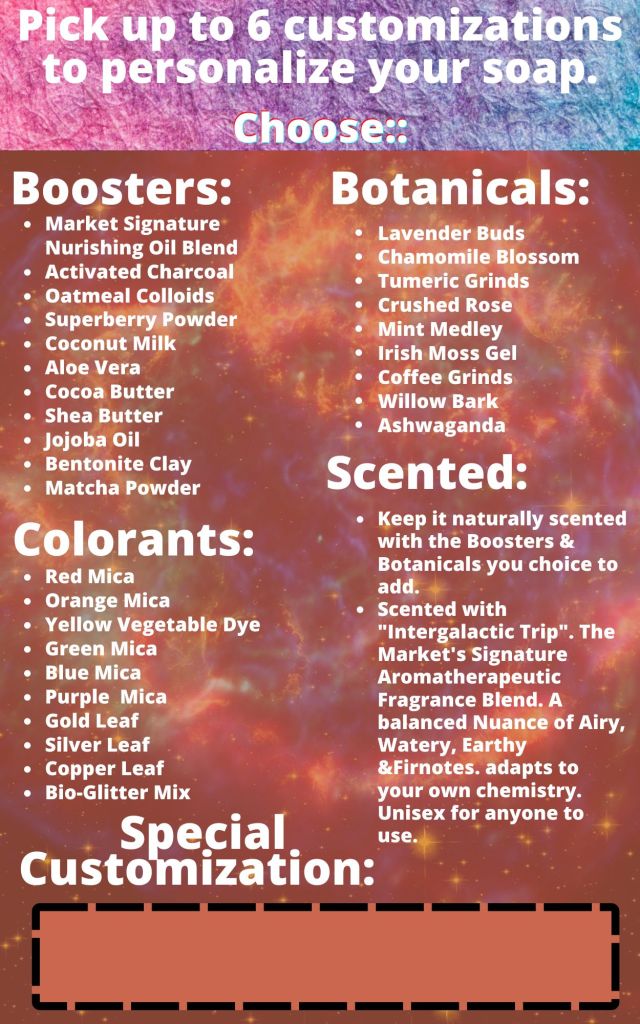 Then you have the option to keep your Bar naturally Scented with the Ingredients you add or choose to have it scented with “Intergalactic Trip” The Market Signature Fragrance blend. It is a thoughtfully blended fragrance of Essential Oils & Fragrance Oil, scented like a mysterious Nuance of Airy, Watery, Earthy and Spicy notes, that adapts to your own body chemistry, is UniSex & everyone can wear.